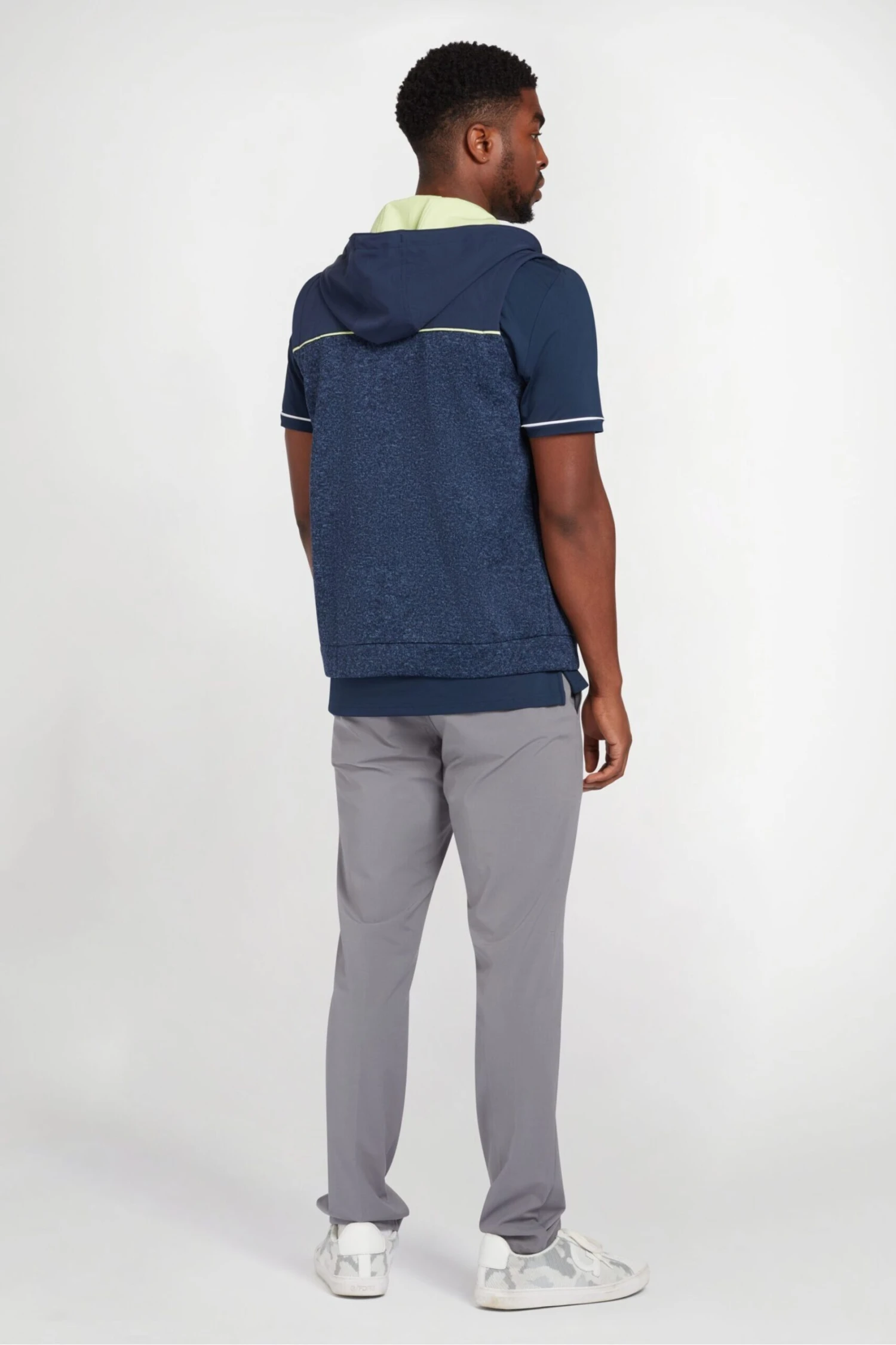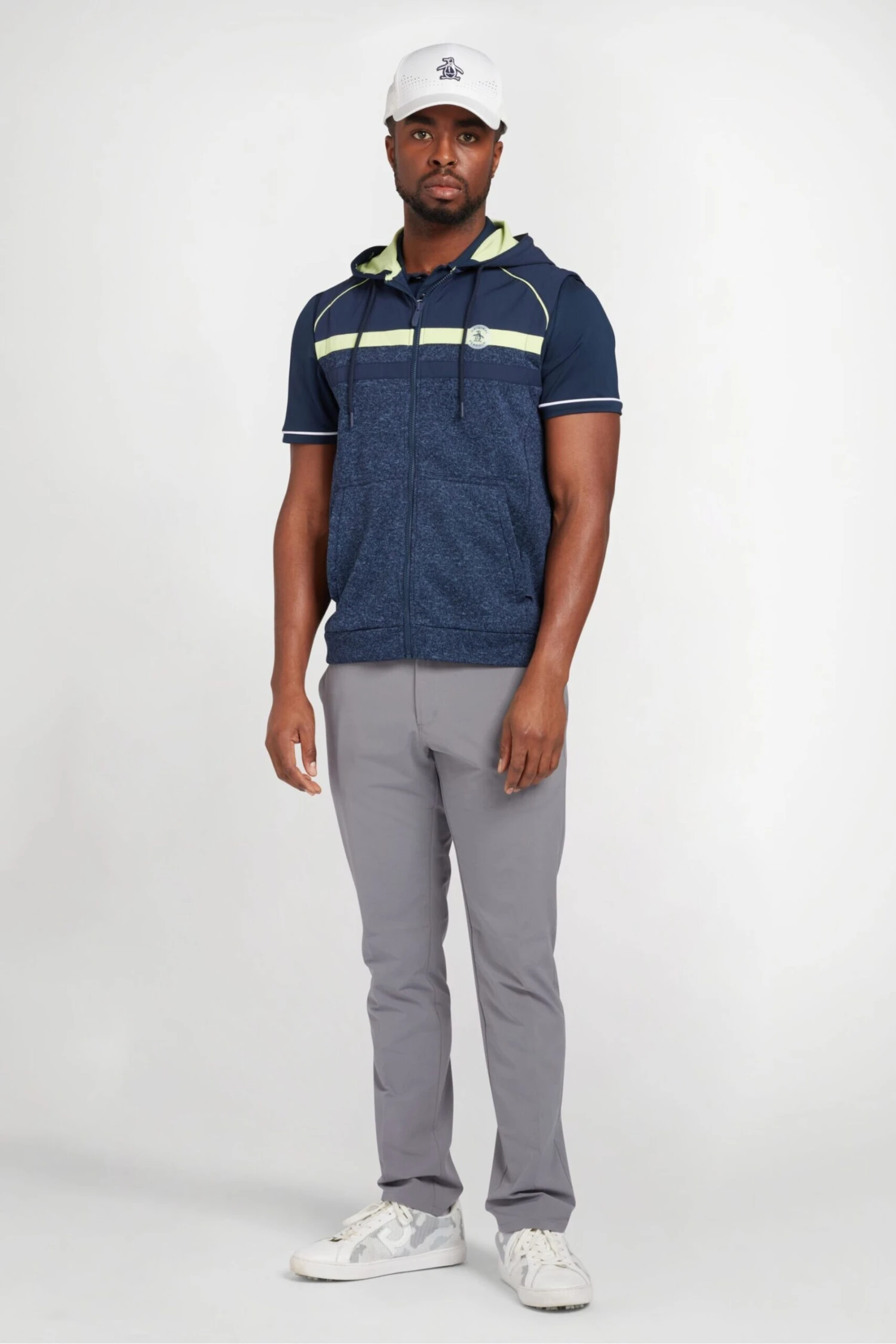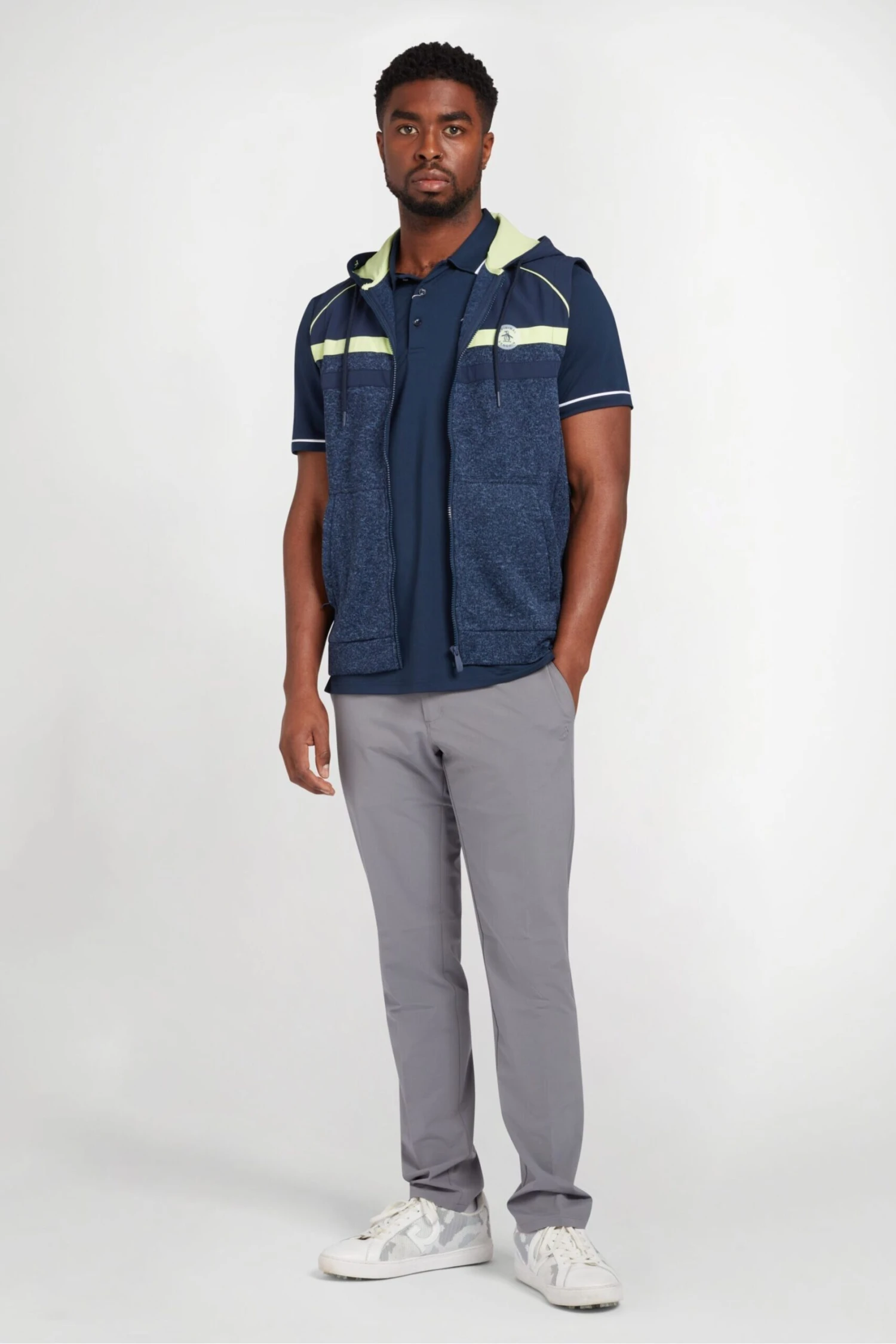 Penguin Golf Heritage Mixed Media hoodie in navy with left chest sticker pete logo, Single knit 3 button placket.