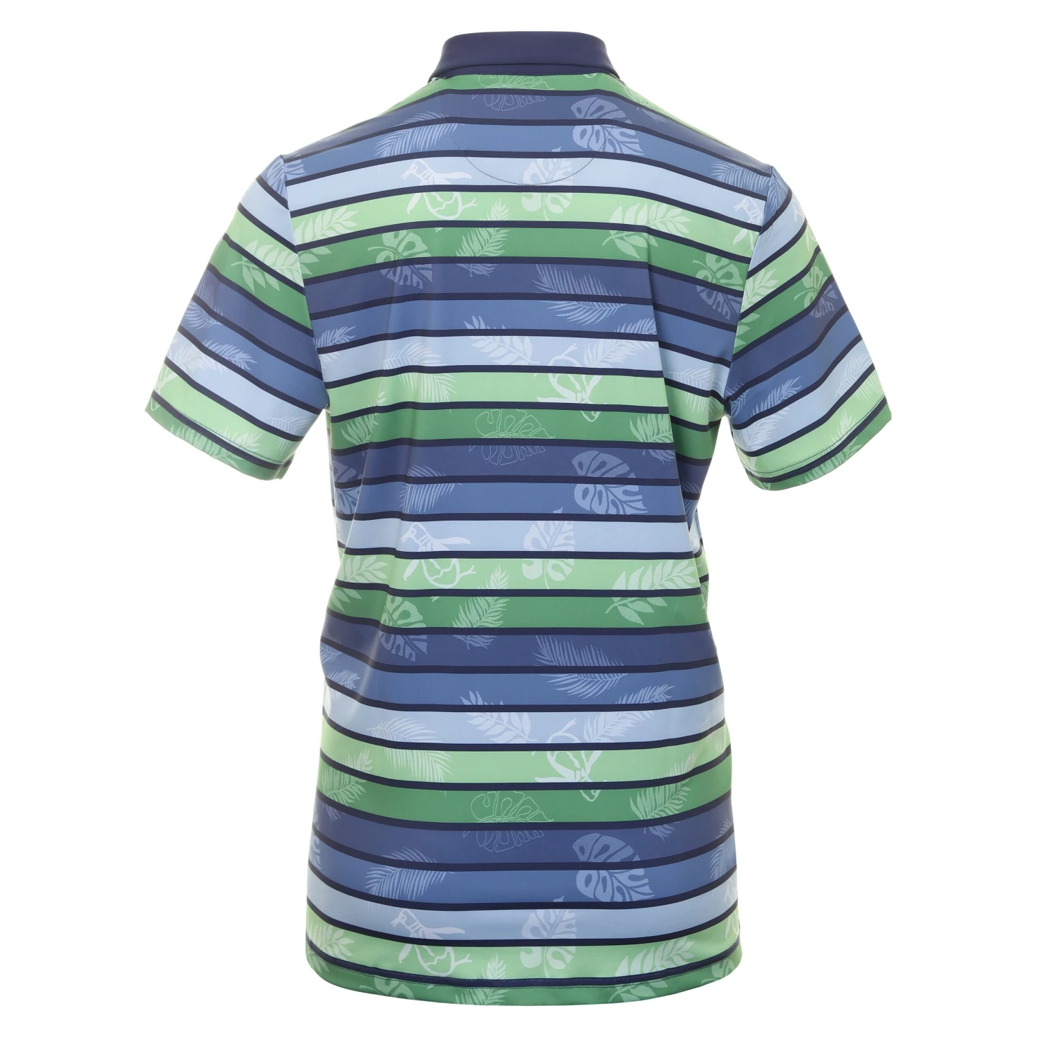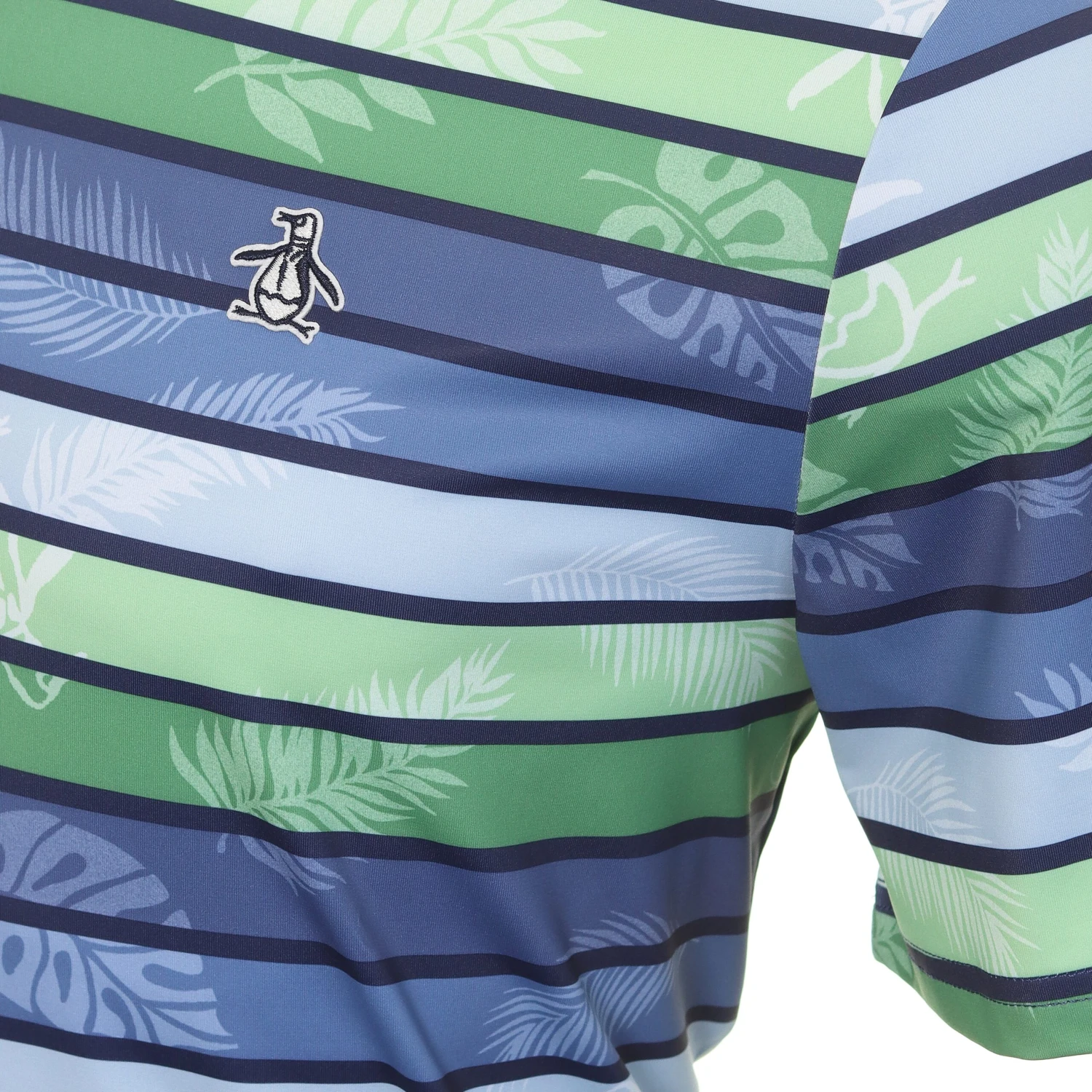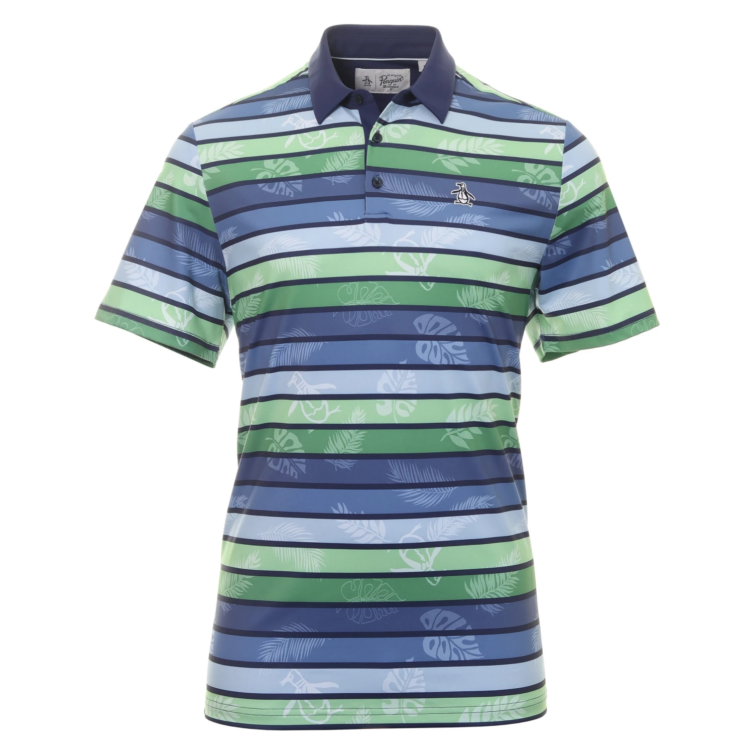 Mens Original Penguin Golf Original Resort Stripe Print Polo Shirt. A 2-button placket polo shirt constructed from a moisture wicking fabric. OPG moisture management system, will keep you fresh and dry throughout your round. Stretch construction fabric adds comfort for a friction free swing.
