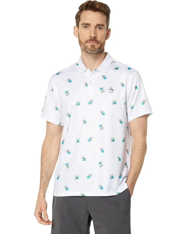 The primary materials that compose this product contain a minimum of 20 percent recycled content.SKU: #9901367Bring on that subtle charm to your game look with the Original Penguin Golf® Performance Heritage Print Tennis Polo. Single knit fabrication creates a lightweight and flexible material. Built-in moisture-wicking properties keeps you feeling dry. Stretchable construction for enhanced comfort. Self polo collar with two-button placket. Short sleeves. Eye-catching printed details throughout. Signature logo embossed on the left chest. Straight hemline. 51% polyester, 35% recycled polyester, 14% elastane. Machine wash, tumble dry.