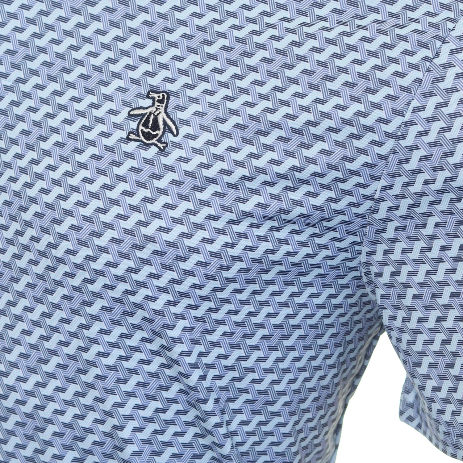 Mens Original Penguin Golf Retro Wave Print Polo Shirt. A 2-button placket polo shirt constructed from a moisture wicking fabric. OPG moisture management system, will keep you fresh and dry throughout your round. Stretch construction fabric adds comfort for a friction free swing.