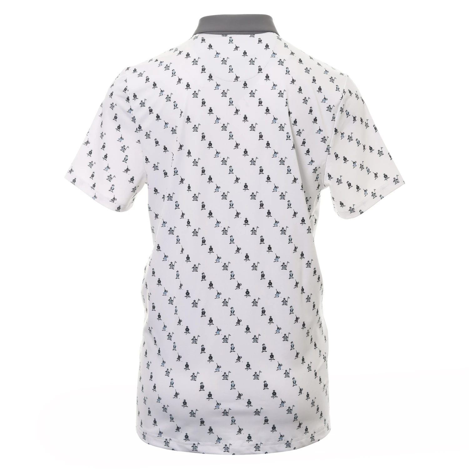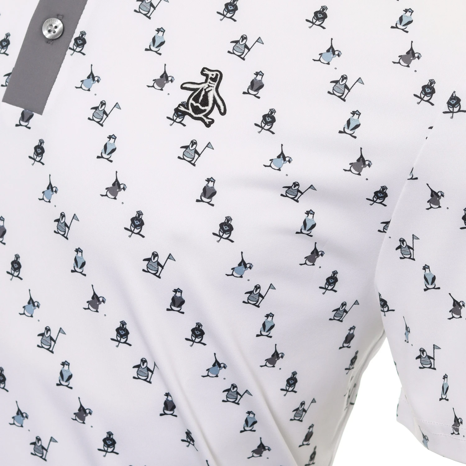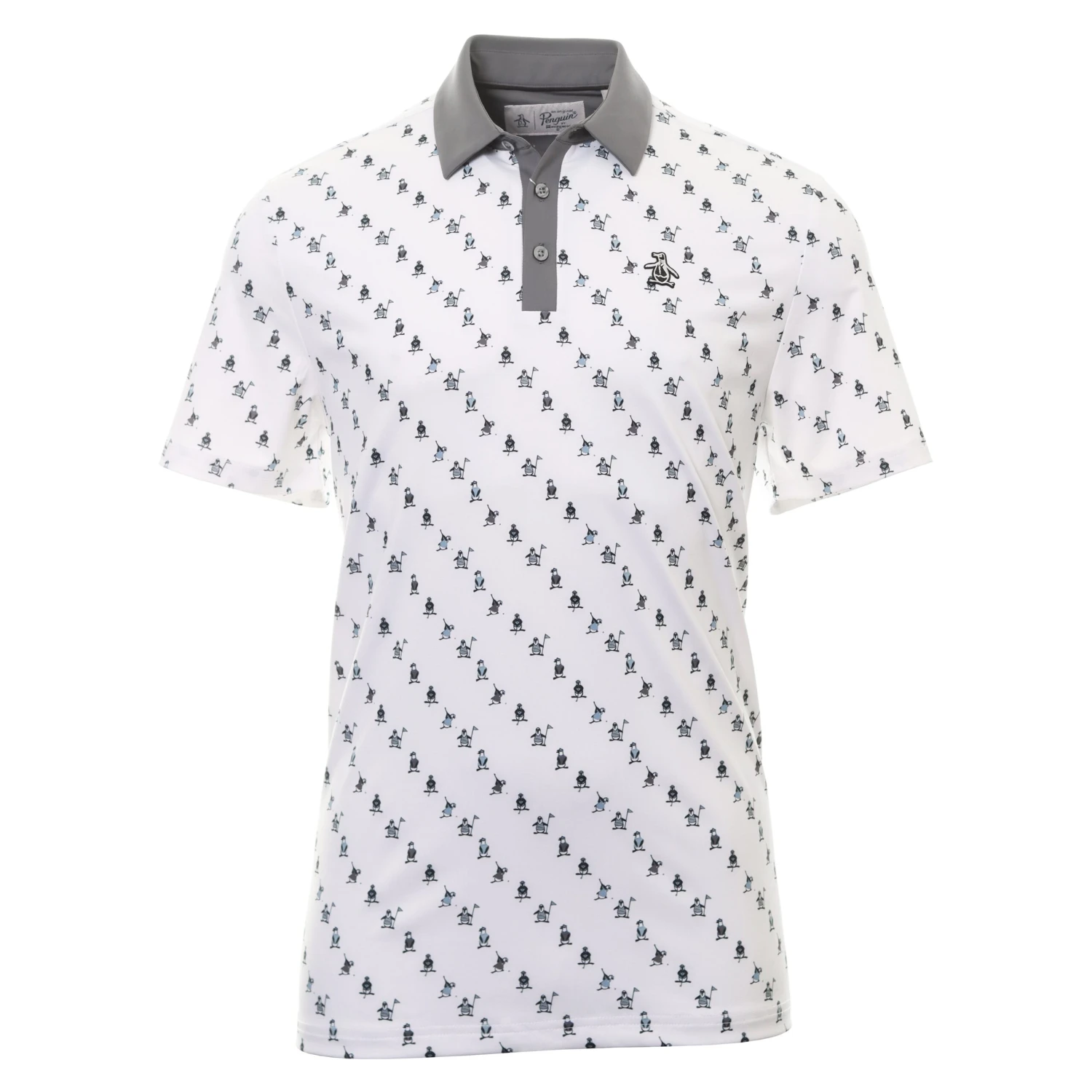 Mens Original Penguin Golf Swinging Pete Novelty Print Polo Shirt. A 3-button placket polo shirt constructed from a moisture wicking fabric. OPG moisture management system, will keep you fresh and dry throughout your round. Stretch construction fabric adds comfort for a friction free swing.