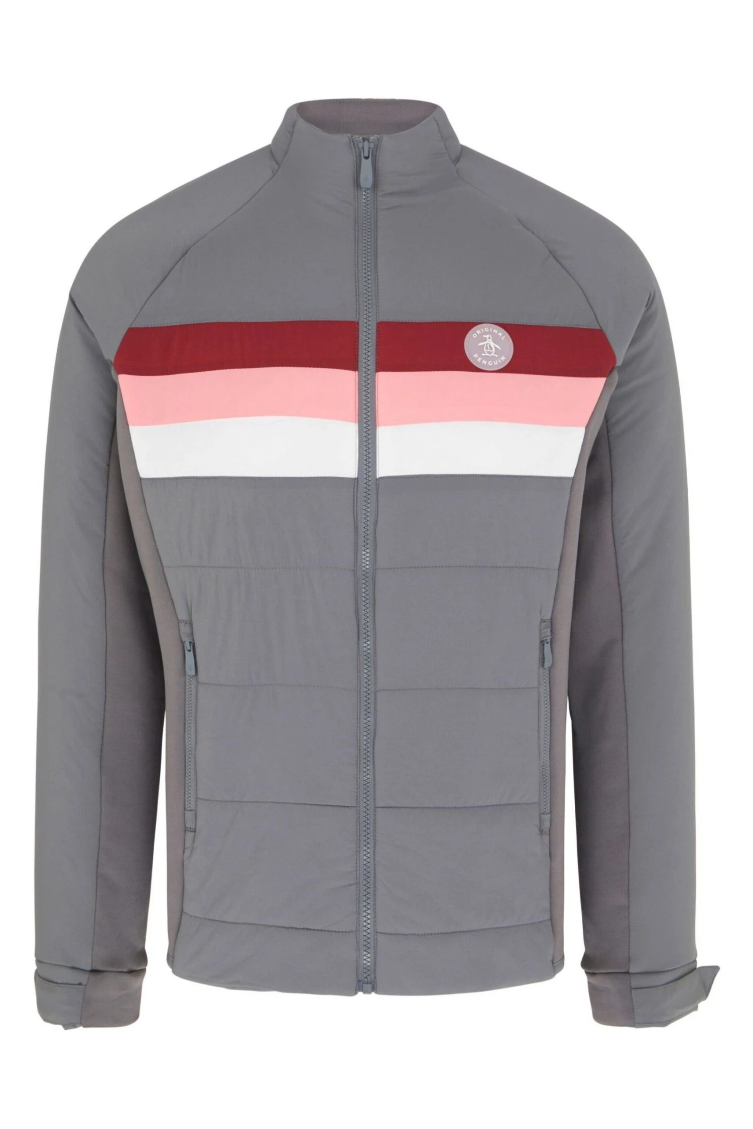 Men’s Original Penguin Golf Insulated Mixed Media Jacket. A full zipped Jacket with OPG Aquapel water-repellent finish and fibre-filled body construction keeping you warm and dry. Knit stretch side panel and adjustable cuff with a Pete logo on the left chest and zipped side pockets.