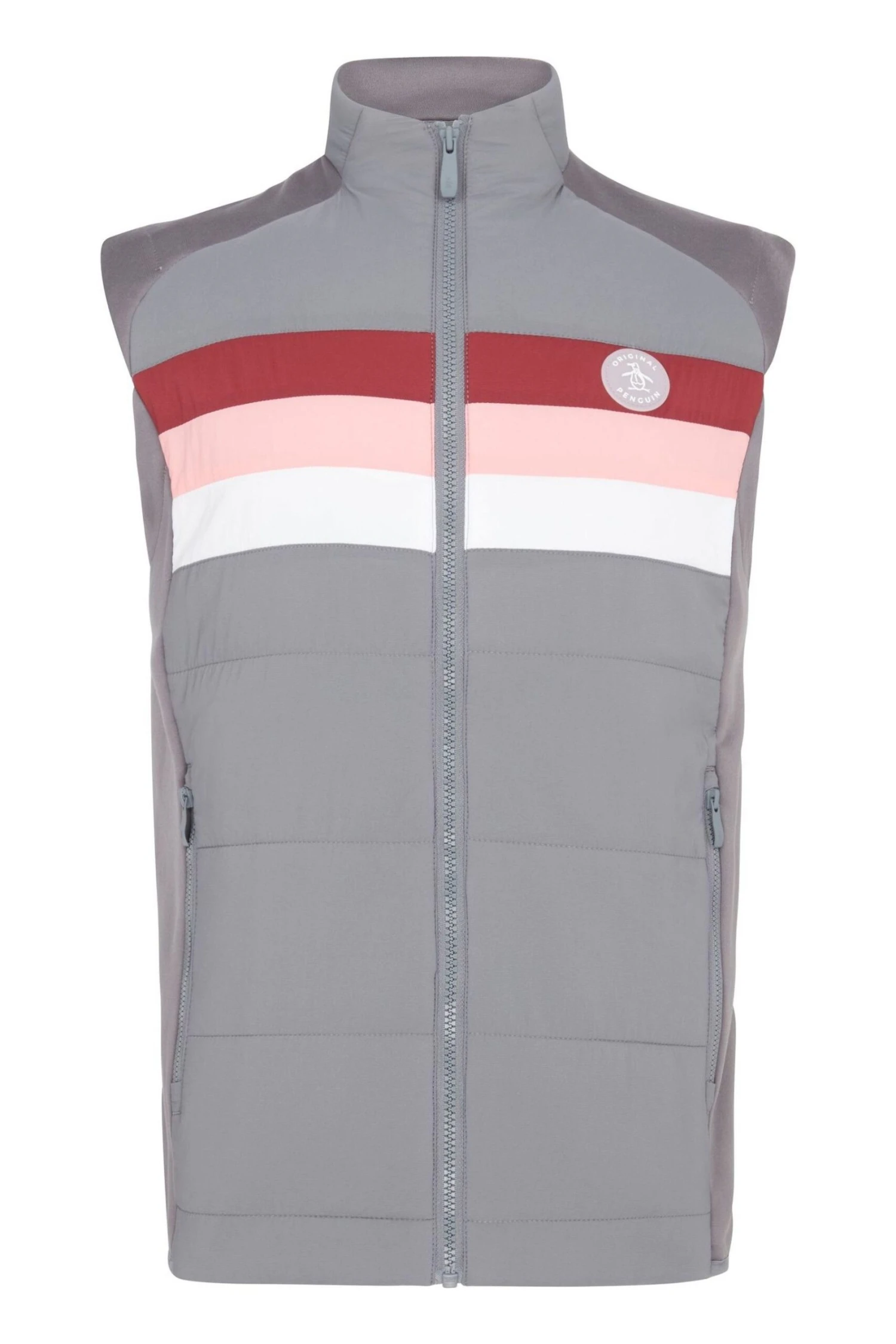 Men’s Original Penguin Golf Insulated Mixed Media Vest. A full zipped Vest with OPG Aquapel water-repellent finish and fibre-filled body construction keeping you warm and dry. Knit stretch side panel and adjustable cuff with a Pete logo on the left chest and zipped side pockets.
